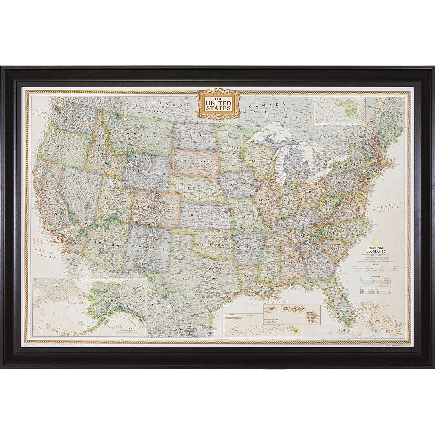 Keep a visual record of your travels stateside with a Wayfarer push-pin travel map. From the adept cartographers of National Geographic, the print depicts a Lambert conformal conic projection of our great republic in it's finest detail. Delightful flourishes and traditional earthly tones typify traditional styling, suitable for the more staid of home decor. This splendid print comes framed in our Contemporary Upscale, featuring a compound profile finished in satin black. Alternate uses for the Wayfarer include: office or customer locations, genealogy, research, and education. Let only your imagination be the limit. Read more