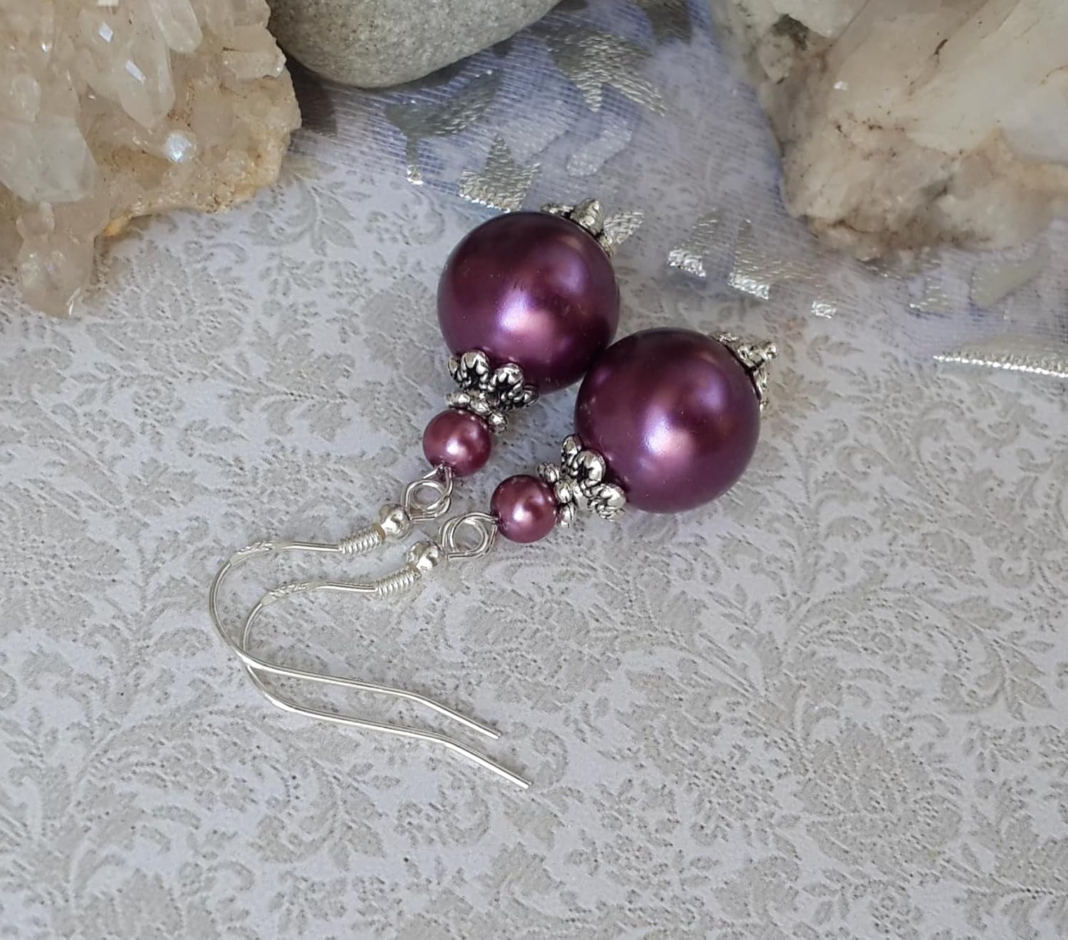 Mauve Pink Purple Burgundy Earrings Handmade Women Jewelry Round Dangle Drop Tibetan Silver 925 sterling Hooks in Gift Box