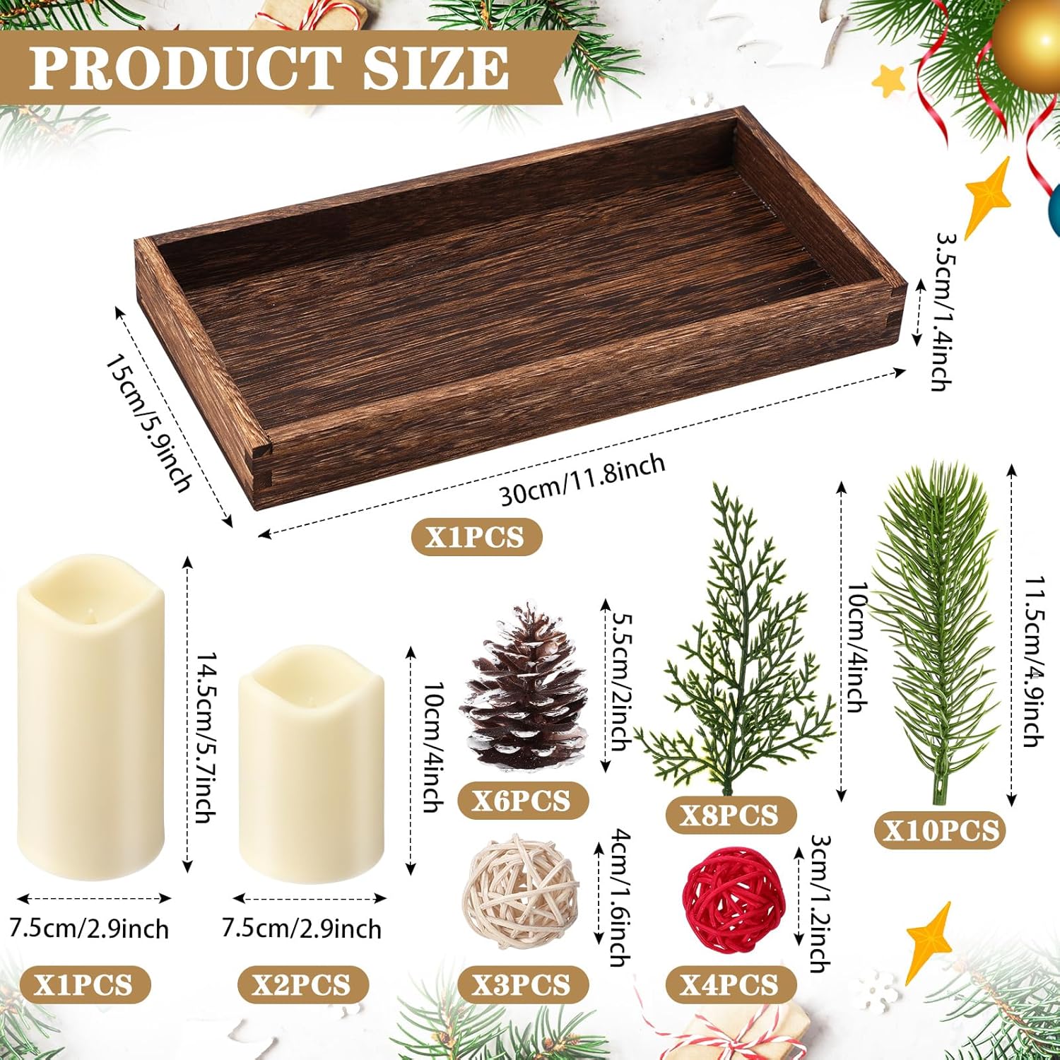 Features: You can put the original accessories from our products in the rustic wooden box, or fill it with your own prepared cane candies, flashing lights, and other decorations to match your home decor. Our farmhouse table centerpieces are large and attractive enough to be the main centerpiece on your dining table, mantel, kitchen island and other places. Specifications: Material: wood, plastic Color: green, brown, red, white Size: Wooden tray: 11.8 x 5.9 x 1.4 inches / 30 x 15 x 3.5 cm (L x W x H) Pine cone: 2.4 inches / 6 cm in height Artificial pine needles: 4.7 inches / 12 cm in height Cypress leaves: 4.7 inches / 12 cm in height Rattan balls: 1.2 inches / 3 cm in diameter. 1.6 inches / 4 cm in diameter Package includes: 1 x Wooden tray 8 x Pine cone 10 x Artificial pine needle 7 x Rattan ball 8 x Cypress leaf Notes: Manual measurement, please allow slight errors on size. The color may exist a slight difference due to different screen displays.