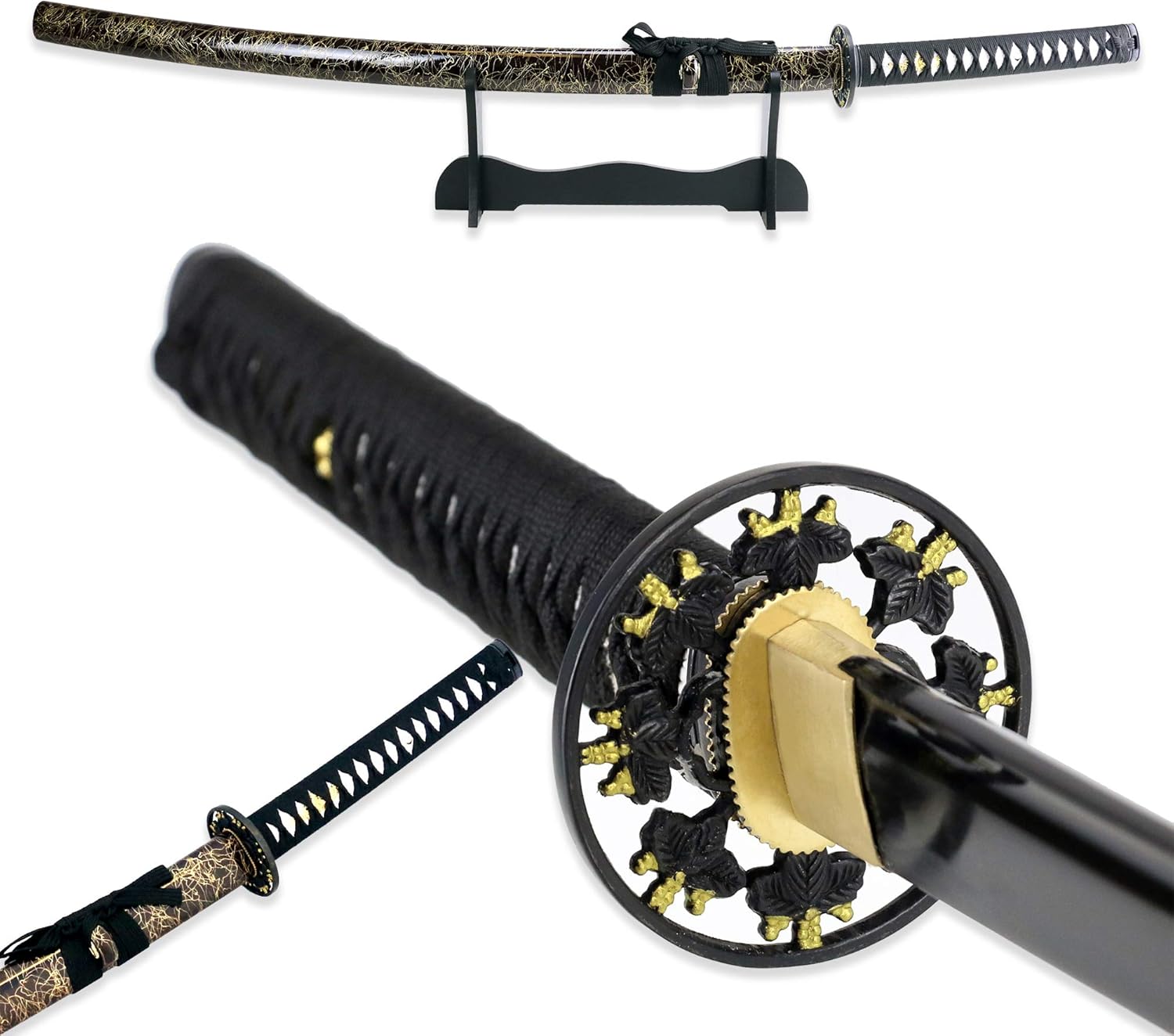 Divine Black Blade Samurai Katana Really nicely hand made Japanese Katana Samurai Sword. What makes this katana special is that it went through special coloring treatment making the blade color to be black. In Japanese culture, black blade katana is believed to be used by persons with divine connection, thus black blade is rare in Japanese katana. This nice katana features high carbon steel blade that is full tang and is razor sharp. The quality of this katana is very good and is well balanced, perfect for practice and demonstration. This sword comes in a cotton black bag which provides extra protection to the sword and its scabbard when in storage or during transportation.