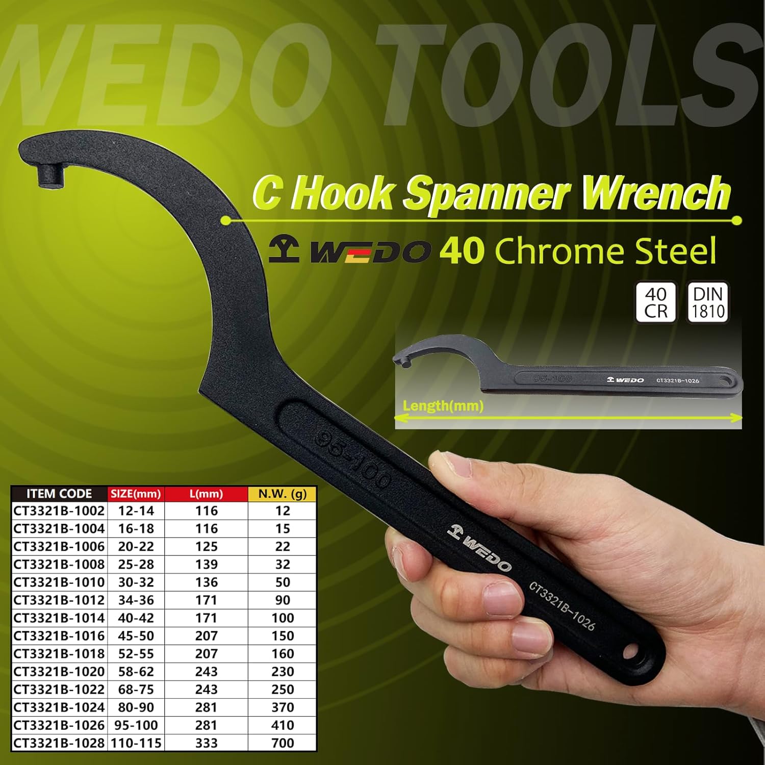 【ADVANTAGES】: Wrenches are One-time die-forged, strong torque. Ergonomic design,comfort and labor saving. High precision mechanical incision, accurate opening size, can be purchased with confidence according to the model size.【FEATURE】: Jumbo Hook Wrench with Pin Black-spray on surface,beautiful and environmental,high anti-rust. Rust and corrosion resistance, long service life. Ergonomic design, comfortable grip, and convenient for long-term use.【PRODUCT STANDAR】: Adopt 40 Chrome Steel as raw material, with good properties such as wear resistance, high strength, etc. It can bear very high loads and impact forces, not easy to cause breakage, so it's very suitable for industrial use. Thickened head for tighter clamping of objects, preventing slipping【APPLICATIONS】: WEDO TOOLS use industrial grade steel as raw materials, suitable for workshops, factories, households and other various applications. Jumbo Wrenches are widely used in marine industries, machine manufacture, mining, large equipment maintenance, etc.【SERVICE】: WEDO TOOLS has been highly praised by our new and old customers because of our user-friendly design concept, continuous improvement of excellent quality and after-sales services. To enhance customers’satisfaction, we set up service centers in Germany, Russia, South Korea, Singapore, Canada, the United States, the united Arab emirates, in order to provide timely after-sales service.